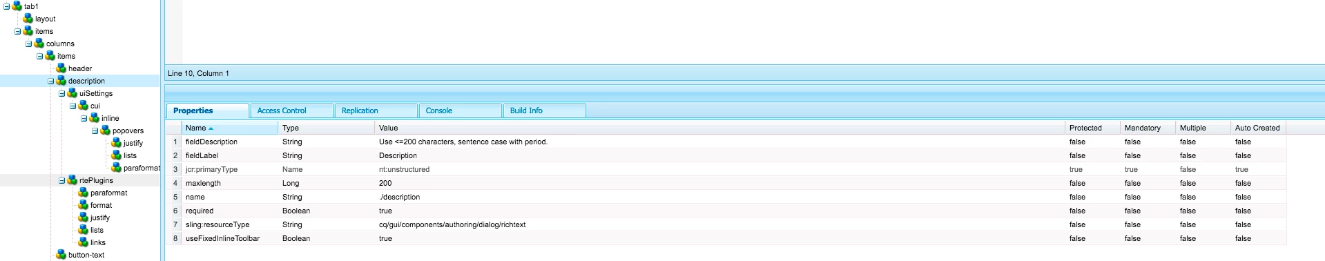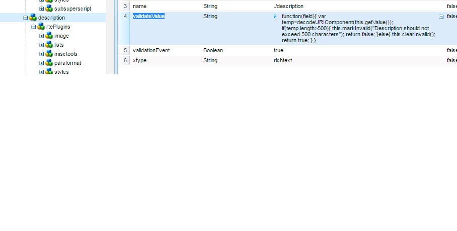 I' making a component that required a rich text field in the dialog. It is working, but the properties maxlength and required do nothing for this field. I have them configured properly but I can add any number of characters and save the dialog with no text in my rich textfield. I did the component taking as a base the richtextfield in /libs/foundation/components/text component because it has a rich text inside the dialog similar to the one I need.
