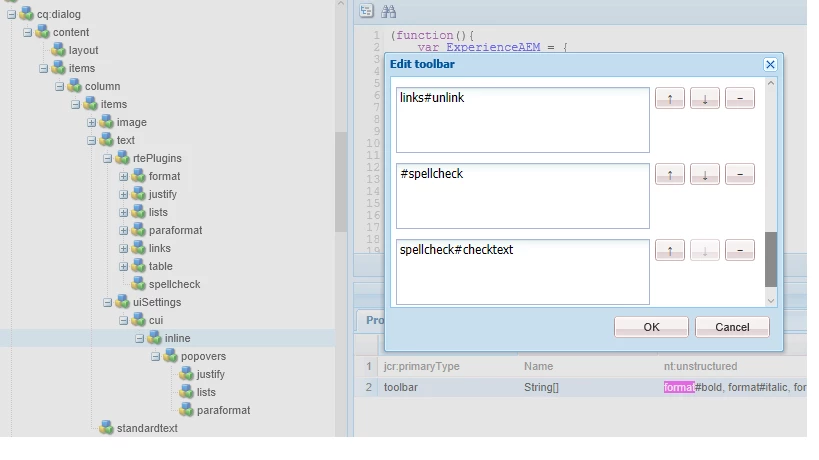 I created basic text component in which I have added spell check plugin for dialog box. Due to this change, somehow ALL the components stop showing Rich Text options in Dialog box and even in Inline options. Double clicking the component just displays a Textarea with no RTE topions at all.