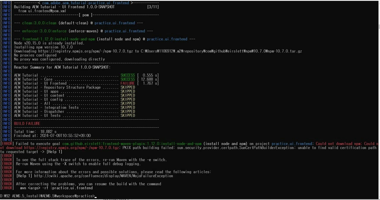 " Failed to execute goal com.github.eirslett:frontend-maven-plugin:1.12.0:install-node-and-npm (install node and npm) on project practice.ui.frontend: Could not download npm: Could not download https://registry.npmjs.org/npm/-/npm-10.7.0.tgz: PKIX path building failed: sun.security.provider.certpath.SunCertPathBuilderException: unable to find valid certification path to requested target -> [Help 1]"