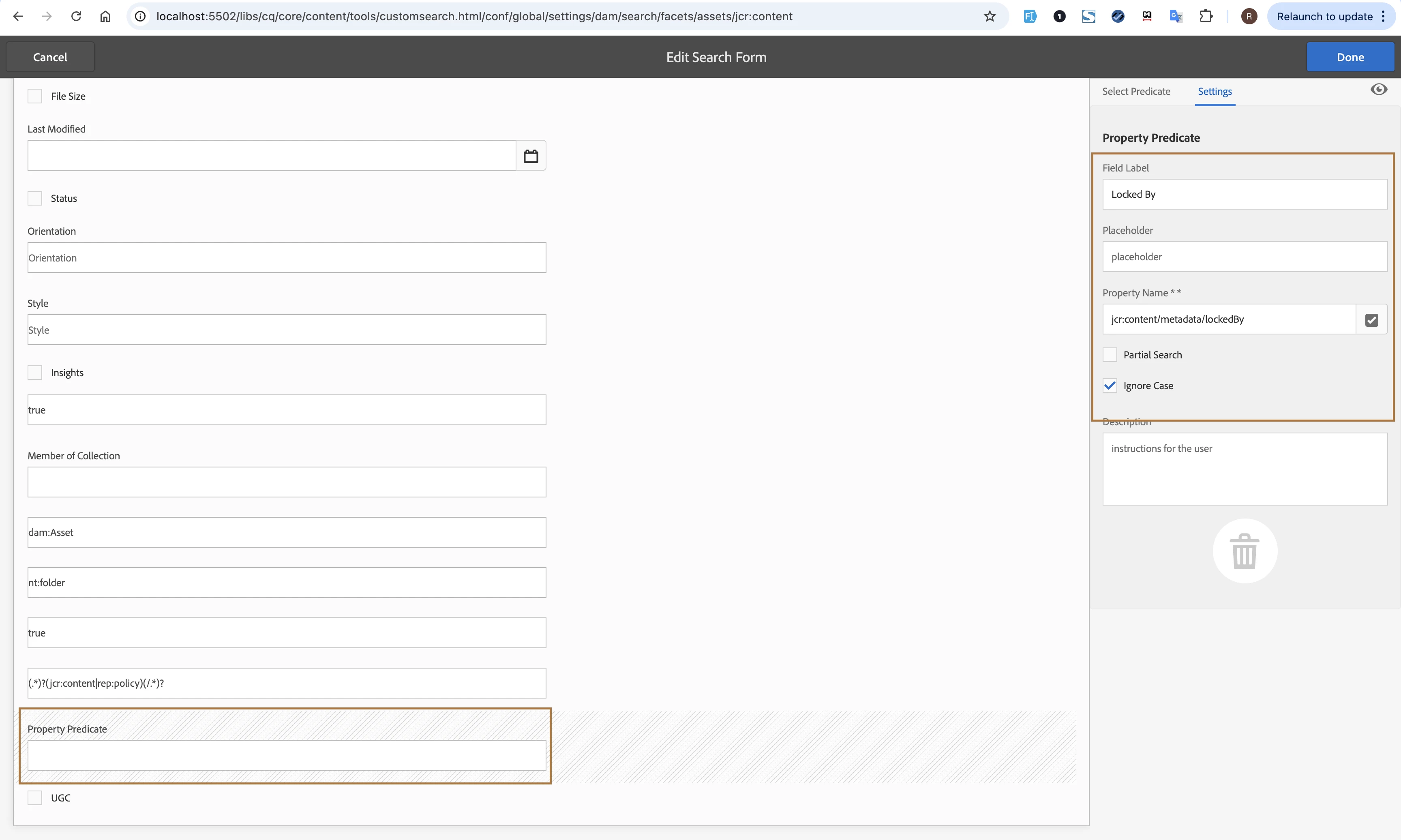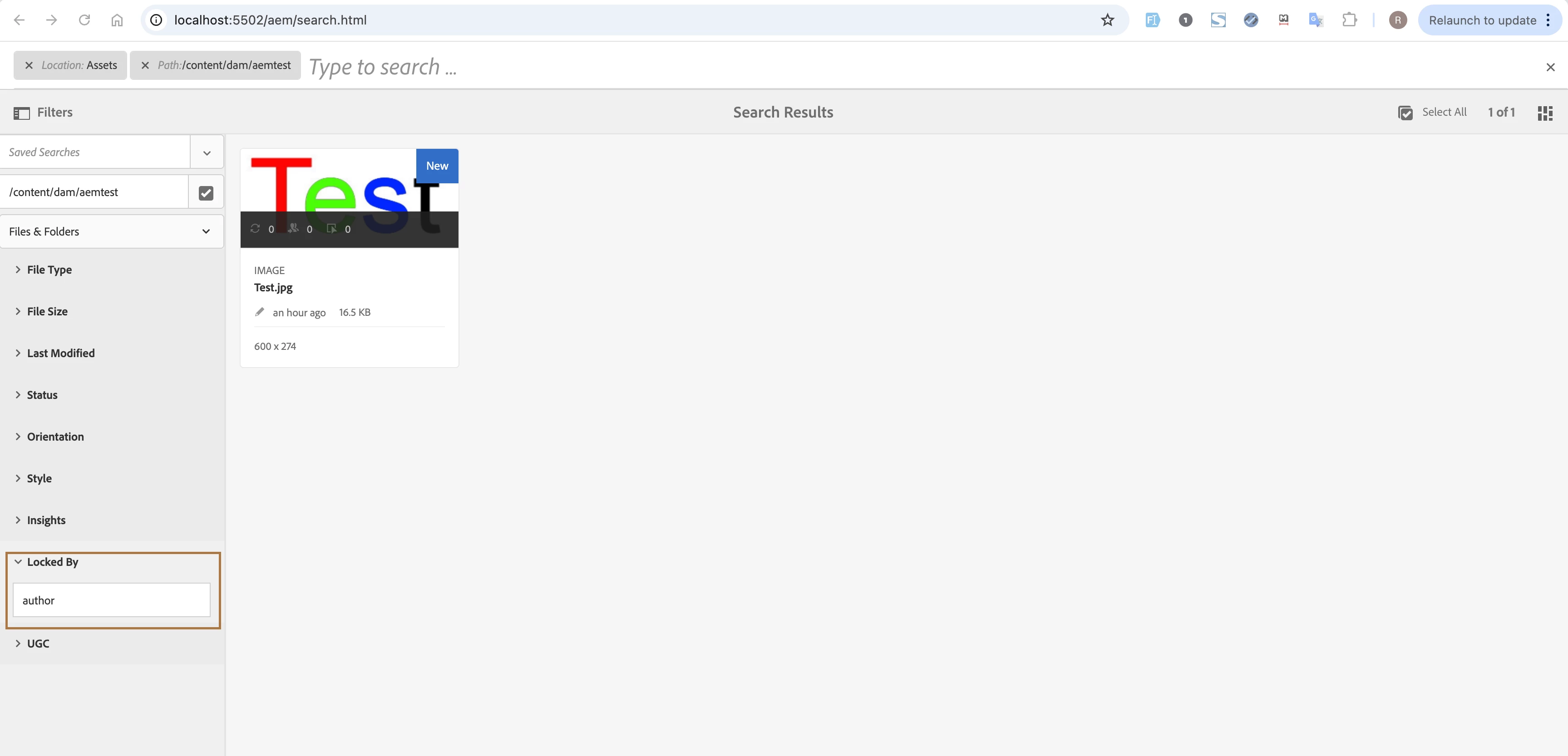 For example, If I search with the text "author" in the Locked By field then I get assets of which the metadata field "lockedBy" is set to "author".