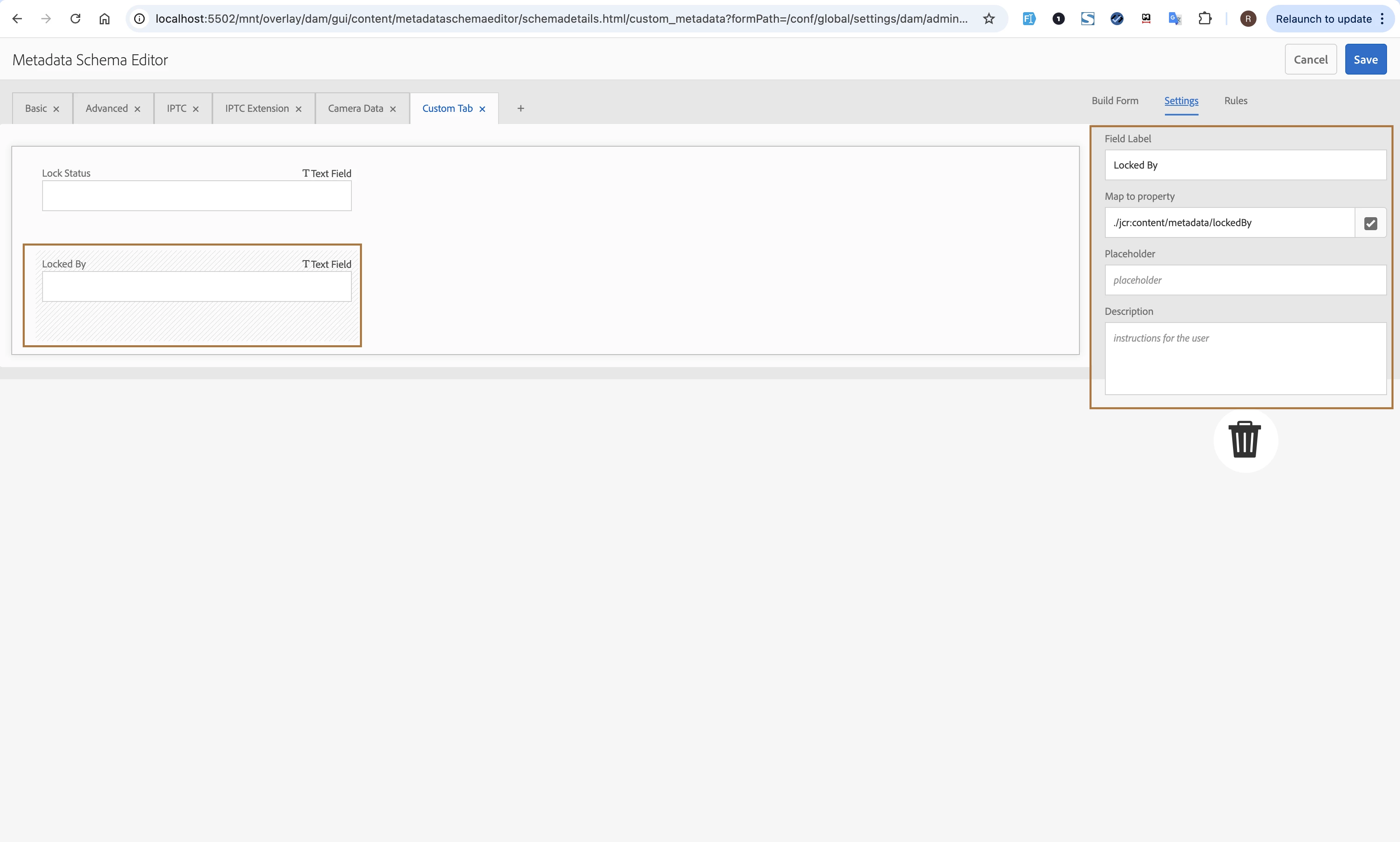 In the asset metadata schema I have added a metadata field called lockedBy. In this field I will enter userId. I want to search assets using logged in user's Id from the asset management screen filter option.