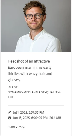 Let’s look at a real-world example. I uploaded a high-resolution TIFF image into Dynamic Media—measuring 3500 x 2636 pixels and weighing in at 26 MB. TIFF, being a lossless format, preserves every detail without introducing compression artifacts or banding. By starting with such a high-quality source, I ensure exceptional clarity even at high zoom levels—ideal for use cases like product zoom on retail sites. Below is a screenshot of the image as seen in AEM Assets.