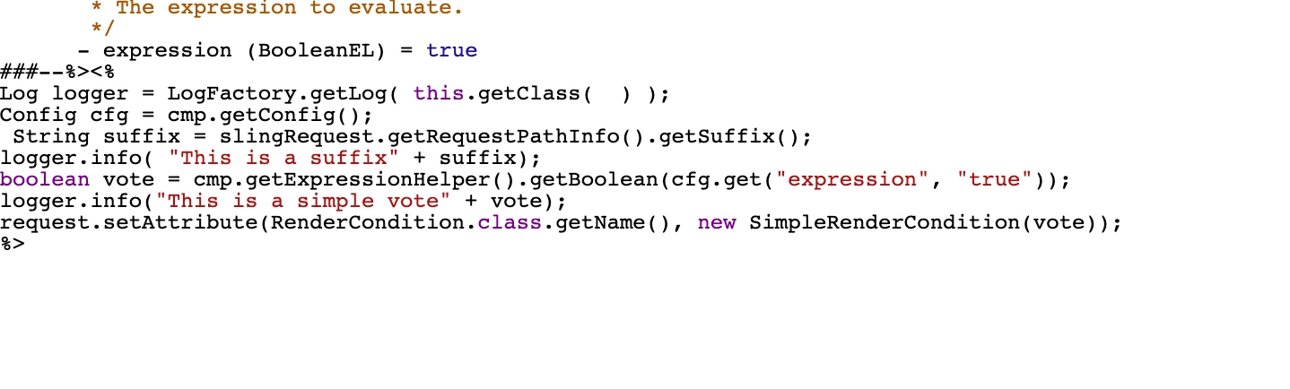 <%@ include file="/libs/granite/ui/global.jsp" %><% %><%@ page session="false" import="com.adobe.granite.ui.components.Config, com.adobe.granite.ui.components.rendercondition.RenderCondition, com.adobe.granite.ui.components.rendercondition.SimpleRenderCondition" %> <%@ page import="org.apache.commons.logging.Log" %> <%@ page import="org.apache.commons.logging.LogFactory" %> <%--### Simple ====== .. granite:servercomponent:: /libs/granite/ui/components/coral/foundation/renderconditions/simple :rendercondition: A condition that takes a simple boolean for the decision. It has the following content structure: .. gnd:gnd:: [granite:RenderConditionsSimple] /** * The expression to evaluate. */ - expression (BooleanEL) = true ###--%><% Log logger = LogFactory.getLog( this.getClass( ) ); Config cfg = cmp.getConfig(); String suffix = slingRequest.getParameter("item"); logger.info( "This is a suffix" + suffix); boolean vote = cmp.getExpressionHelper().getBoolean(cfg.get("expression", "true")); request.setAttribute(RenderCondition.class.getName(), new SimpleRenderCondition(vote)); %>