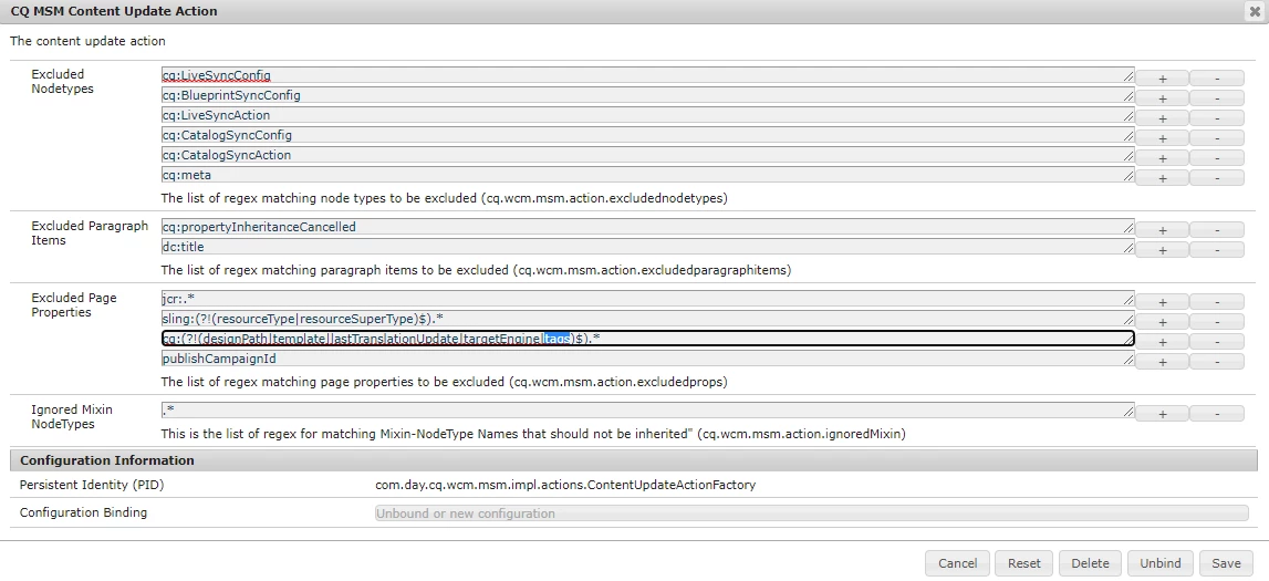 If I create com.day.cq.wcm.msm.impl.actions.ContentUpdateActionFactory.config under my project apps/config, I see the CQ MSM Content Update Action in OSGi Configuration console which just gets overwritten with my values. However, if another project creates the same config, the CQ MSM Content Update Action Configuration will be overwritten be their values.