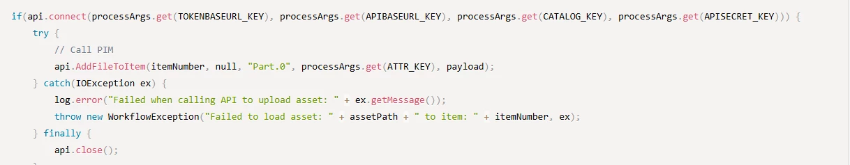log.info("UploadAssettoPIM finished");Here are the connect and AddFileToItem methods: