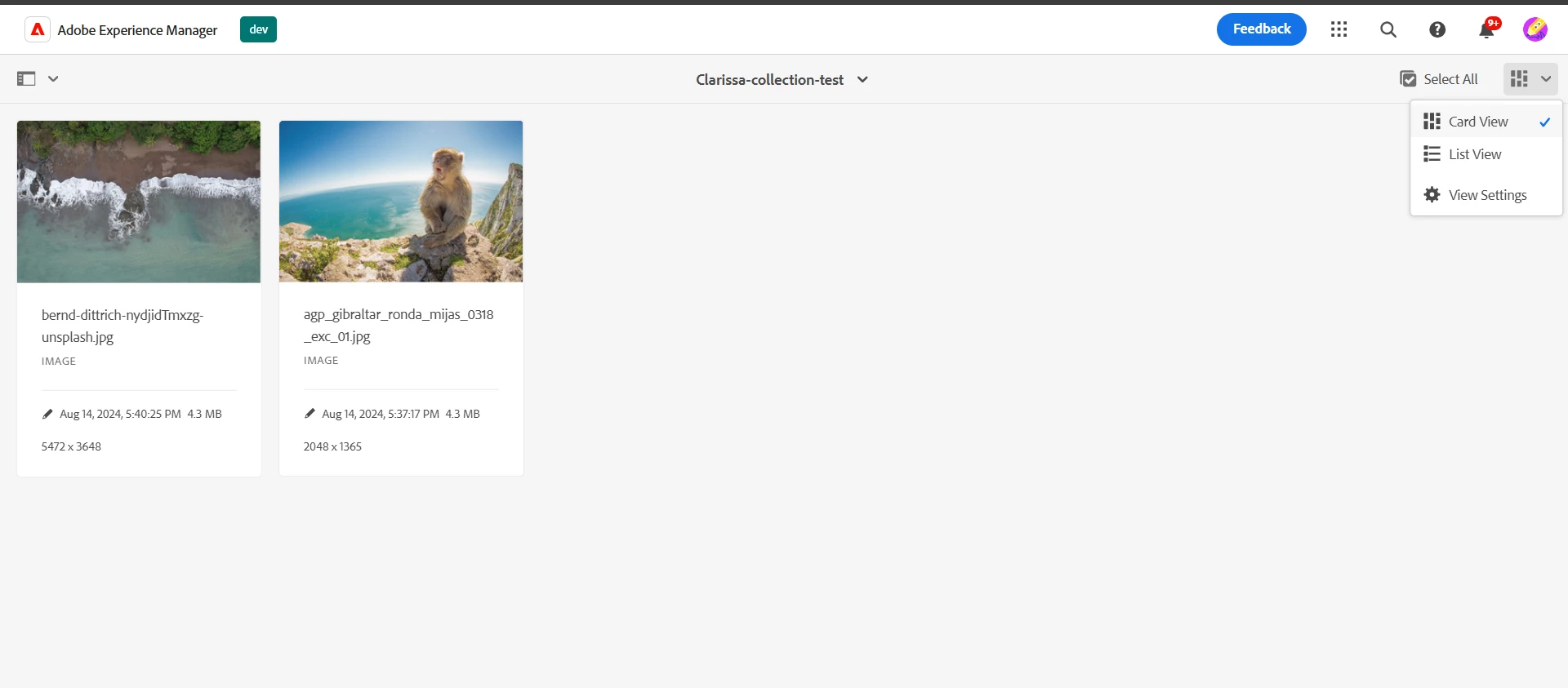 Users created multiple collections but navigating into them using the card view, they are not able to easily sort the assets using name, title or other information like already happens for list view. Users require to have sortable functionality in the card view because they should have the possibility to see quickly preview of the asset to select from an ordered list. Same behaviour from list view is expected. |