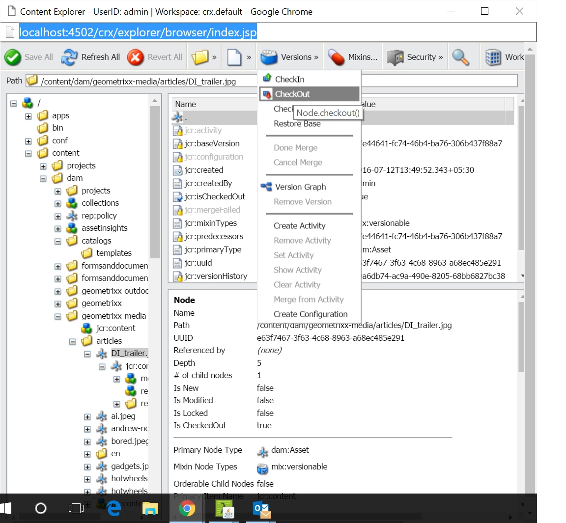 javax.jcr.version.VersionException: Cannot set property. Node is checked in.