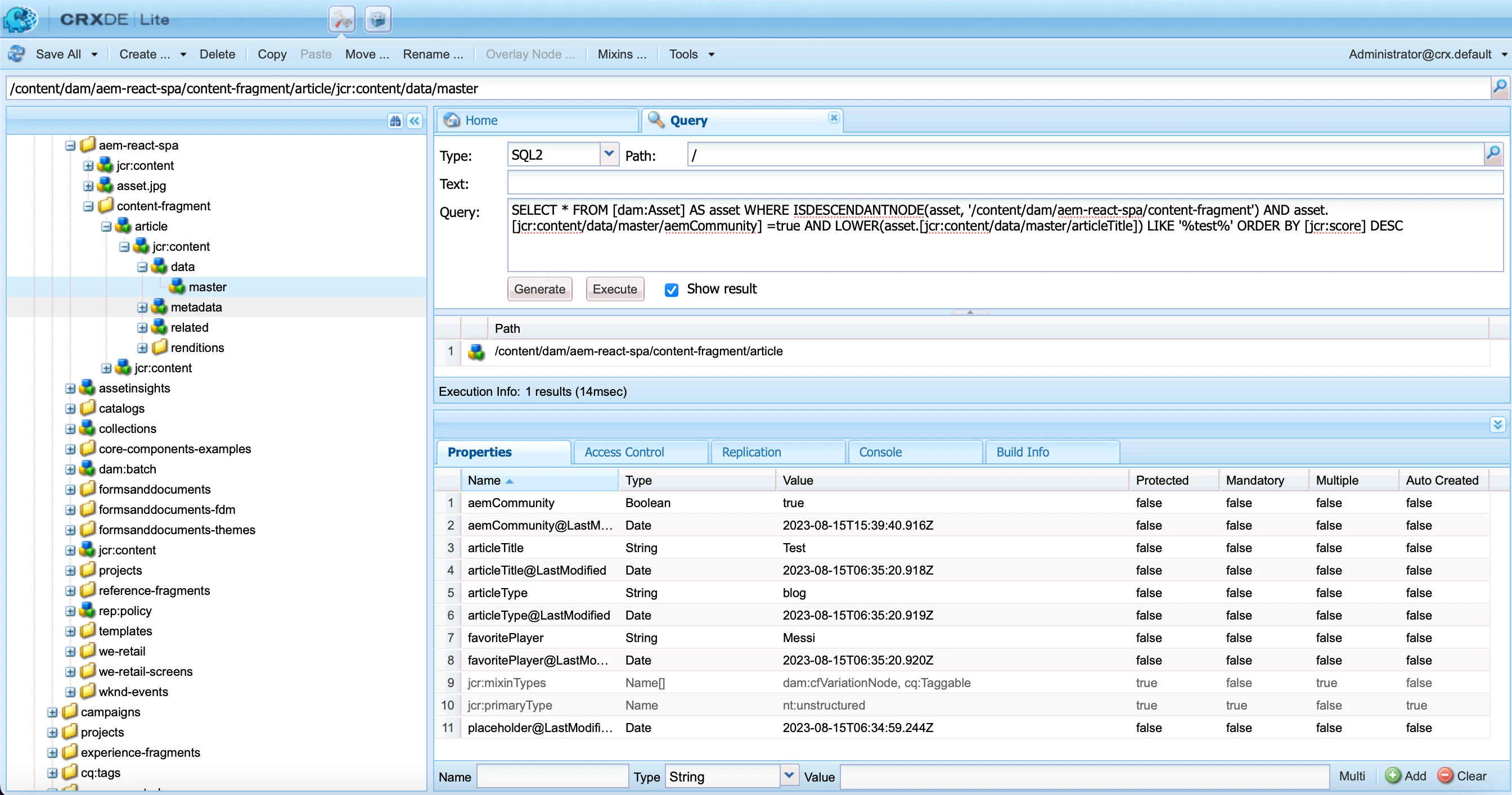 SELECT * FROM [dam:Asset] AS asset WHERE ISDESCENDANTNODE(asset, '/content/dam/testProject/content-fragments/en_us') AND asset.[jcr:content/data/master/isFeatured] = true AND LOWER(asset.[jcr:content/data/master/myProperty]) = 'test' ORDER BY [jcr:score] DESC