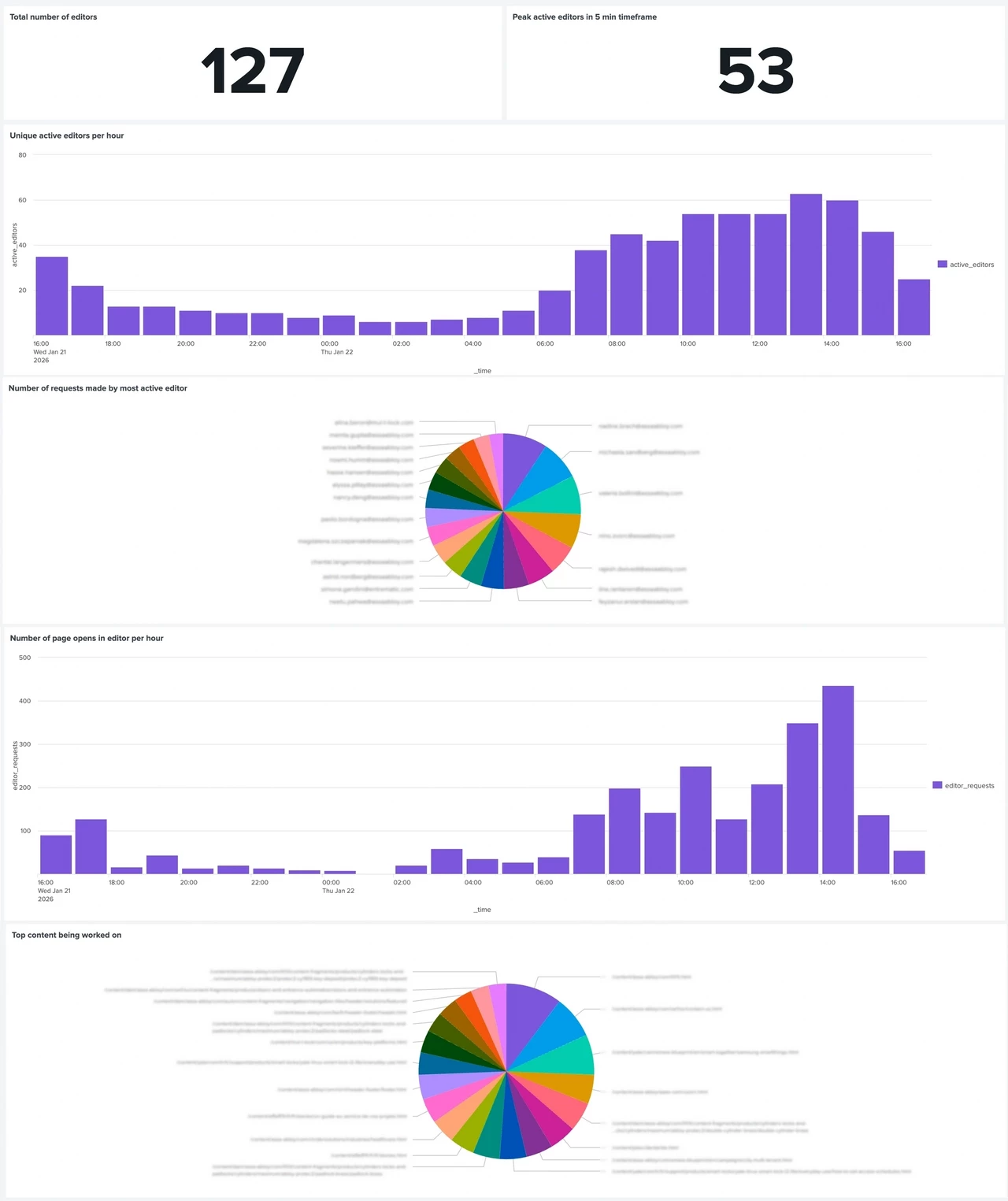 Page opens in the editor are a strong indicator of active content creation and are relatively expensive operations. Visualizing these events per hour highlights when Author load is likely to peak due to real authoring work. This data is useful when correlating performance issues with editorial activity.