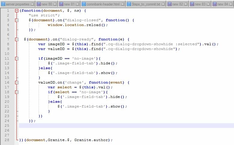 (function(document, $, ns) { "use strict"; $(document).on("dialog-closed", function() { window.location.reload(); }); // below method will be triggered during dialog load $(document).on("dialog-loaded", function (event) { $(".no-image").each(function () { Coral.commons.ready($(this), function (element) { var product = element.val(); showHide(product); }); }); }); // below method will be triggered during change of drop-down $(document).on("change", ".no-image", function () { showHide($(this).val()); }); // custom method to show or hide 'Image' tab based on No image selection from drop-down function showHide(product){ if(product == 'no-image'){ var a = $('.image-tab').parent().parent("coral-panel[role='tabpanel']").attr('aria-labelledby'); $('#'+a).hide(); }else{ var a = $('.image-tab').parent().parent("coral-panel[role='tabpanel']").attr('aria-labelledby'); $('#'+a).show(); } } })(document,Granite.$, Granite.author);​