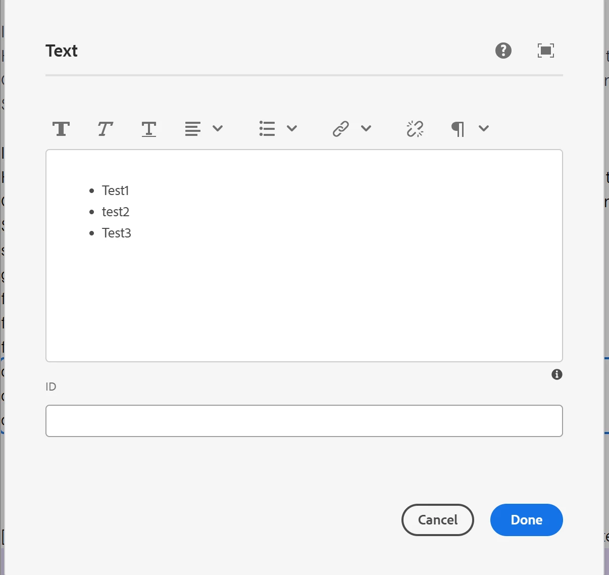 i was trying to author the text component (sling:resourceSuperType core/wcm/components/text/v2/text), in authoring mode we were able to author bullet List as shown in screen below.