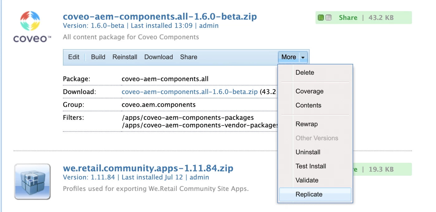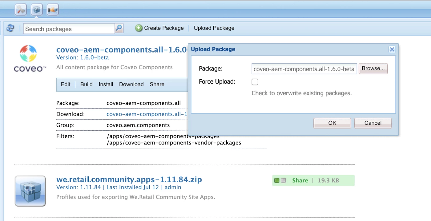 Step 2: Open CRX Package Manager in AEM, then upload and install the Coveo connector package.