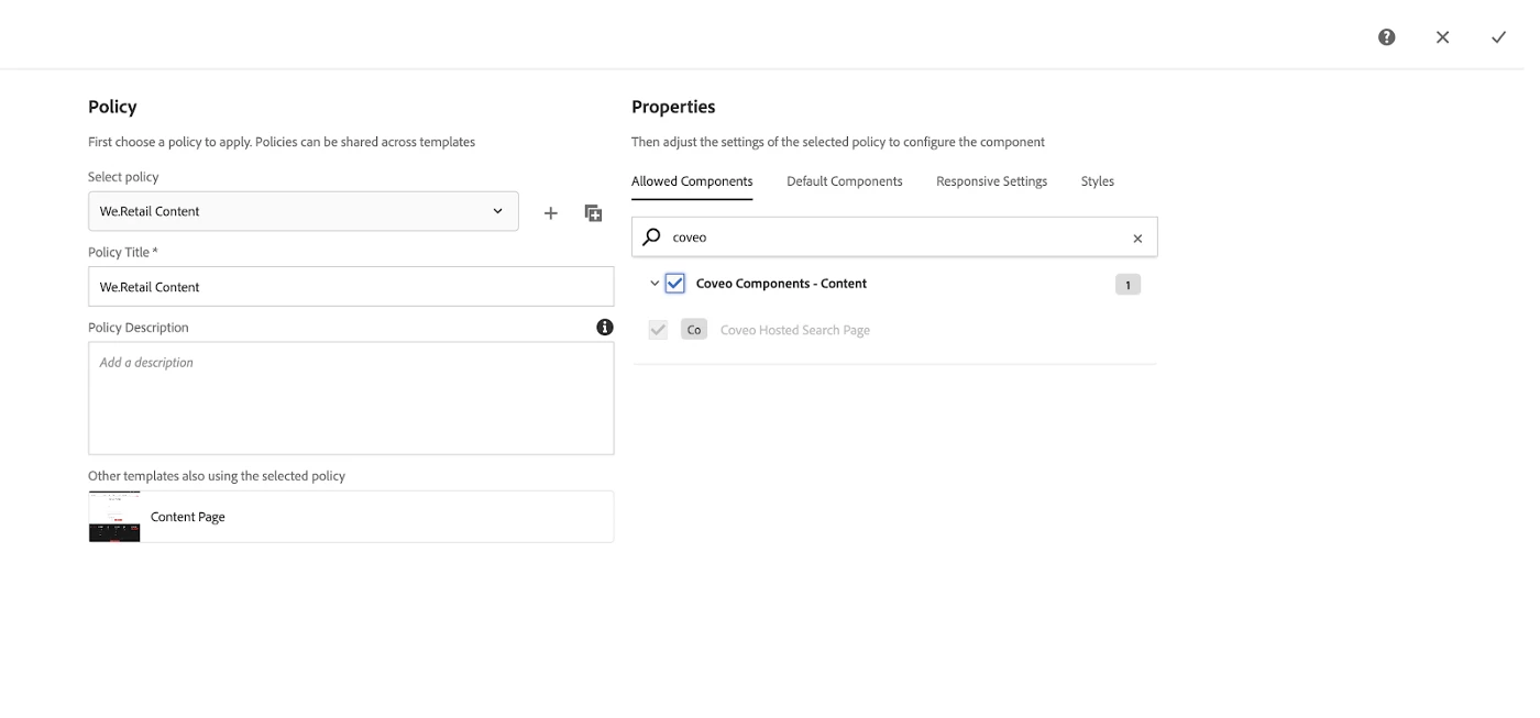 Under Properties, in the Allowed Components tab, search for Coveo and select the checkbox. Select ✓ to save the changes.