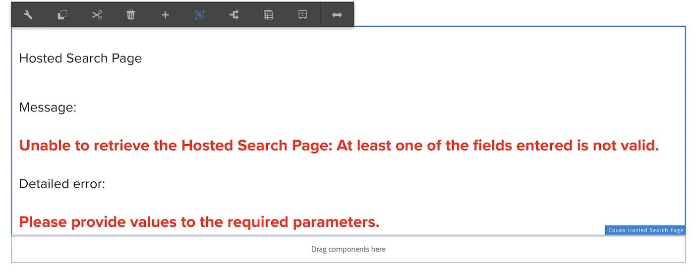 Step 6 — Now Go to the search page. Add Coveo component. Initially, when you add the Coveo component it will give you an error message. It is because we have not yet configured the component properly.