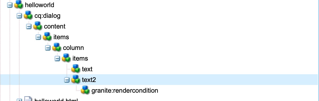 - Add a node “granite:rendercondition” with following properties in the above component field (text2).
