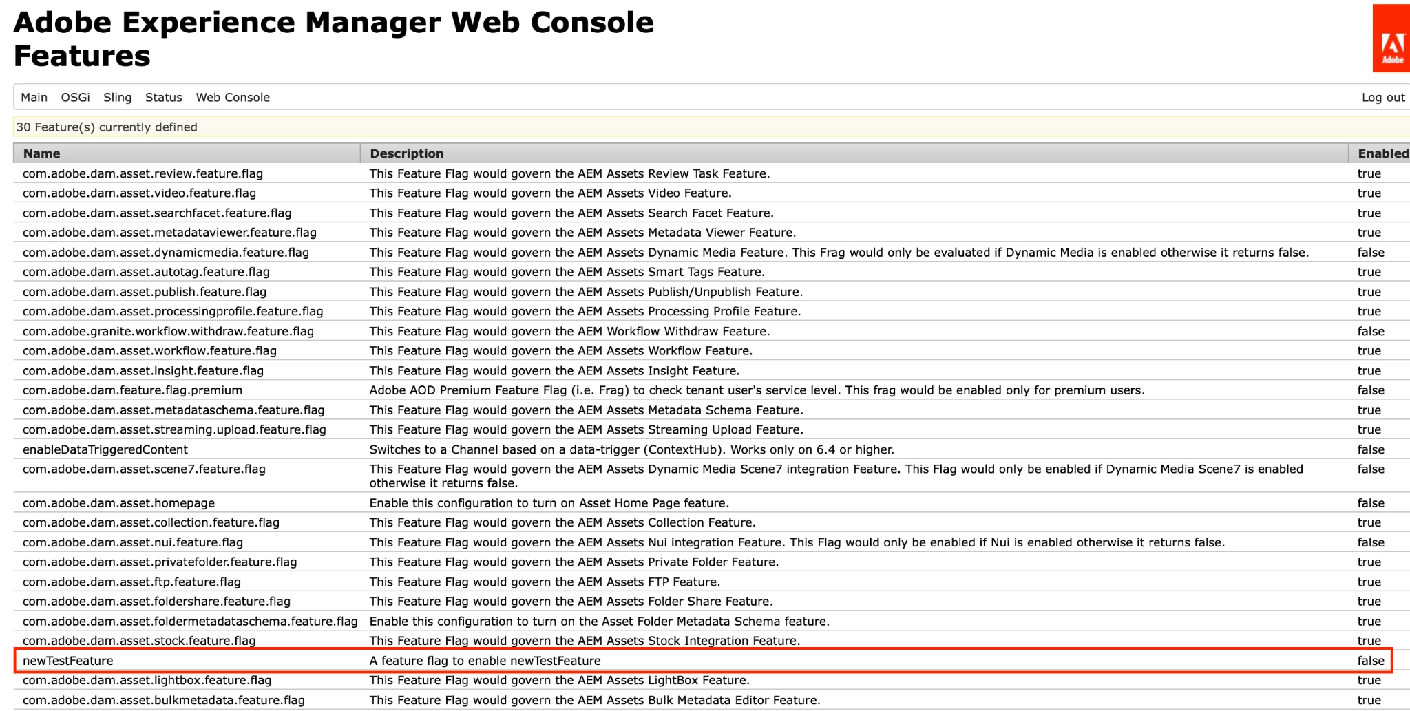 import org.apache.sling.featureflags.Feature; import org.apache.sling.featureflags.ExecutionContext; import org.osgi.service.component.annotations.Component; @Component(service = Feature.class, immediate = true) public class TestFeatureFlagService implements Feature { public String getDescription() { return "Test Feature Flag"; } public String getName() { return "test-feature-flag-name"; } public boolean isEnabled(ExecutionContext ec) { // add logic to enable or disable feature flag //The ExecutionContext interface provides access to the context for evaluating whether a feature is enabled or not. return true; } } - test-feature-flag-name can be used to compare it at the component level or in sightly to enable or disable the feature.