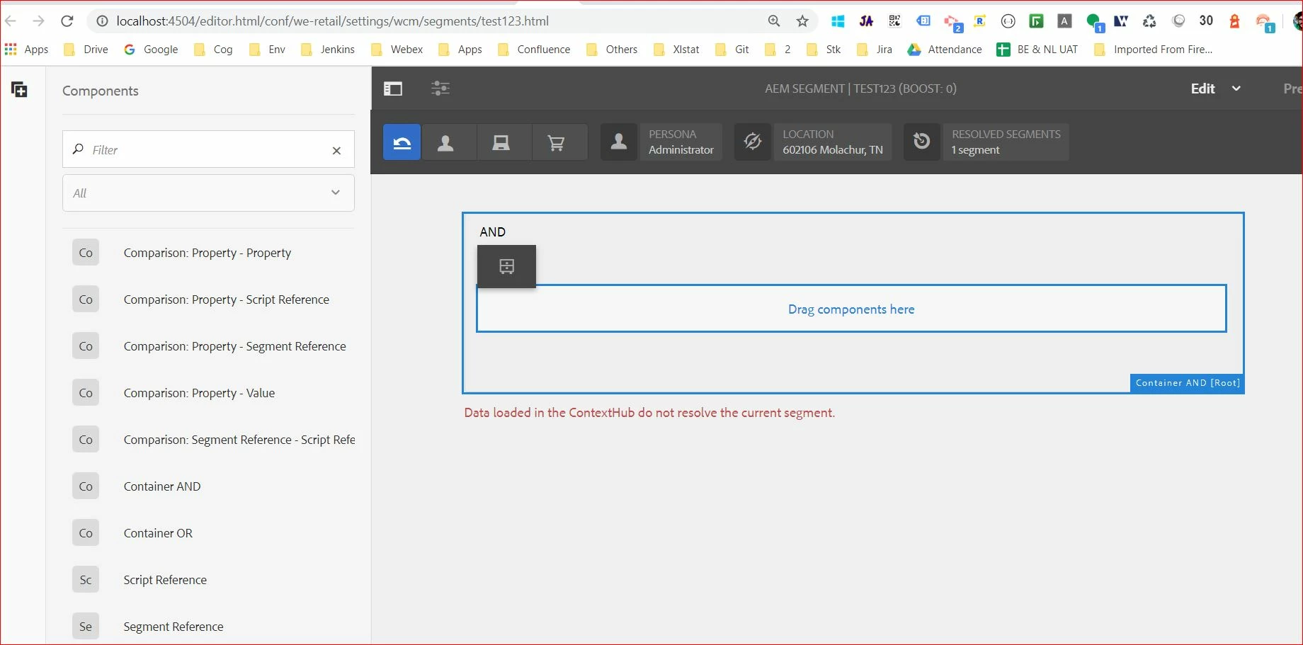 We can not add any component on segment page, the parsys does not have + button to add component and drag and drop is also not working. Tried to create a segment with new configuration and also with we.retail config, facing the same problem on both.