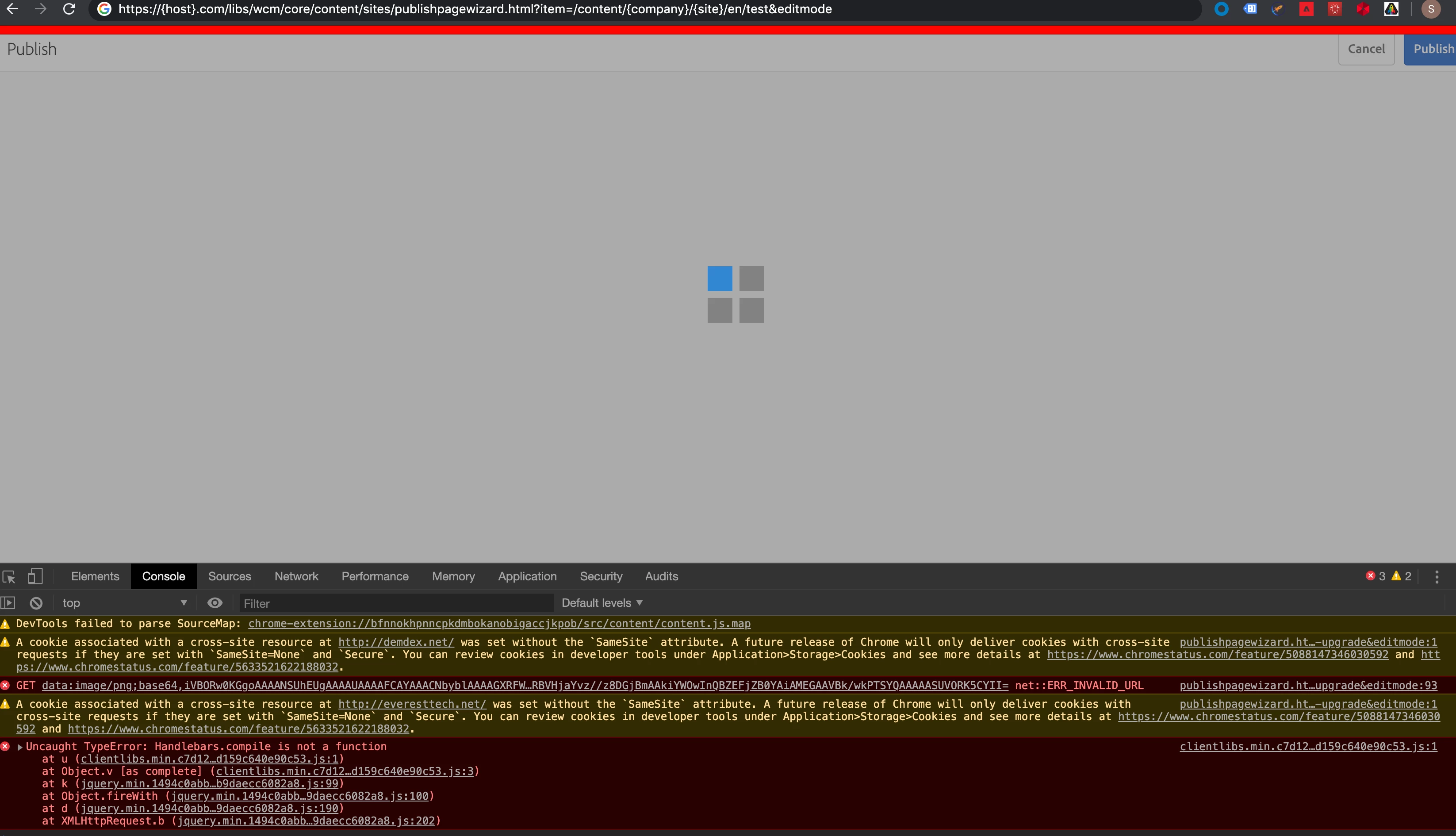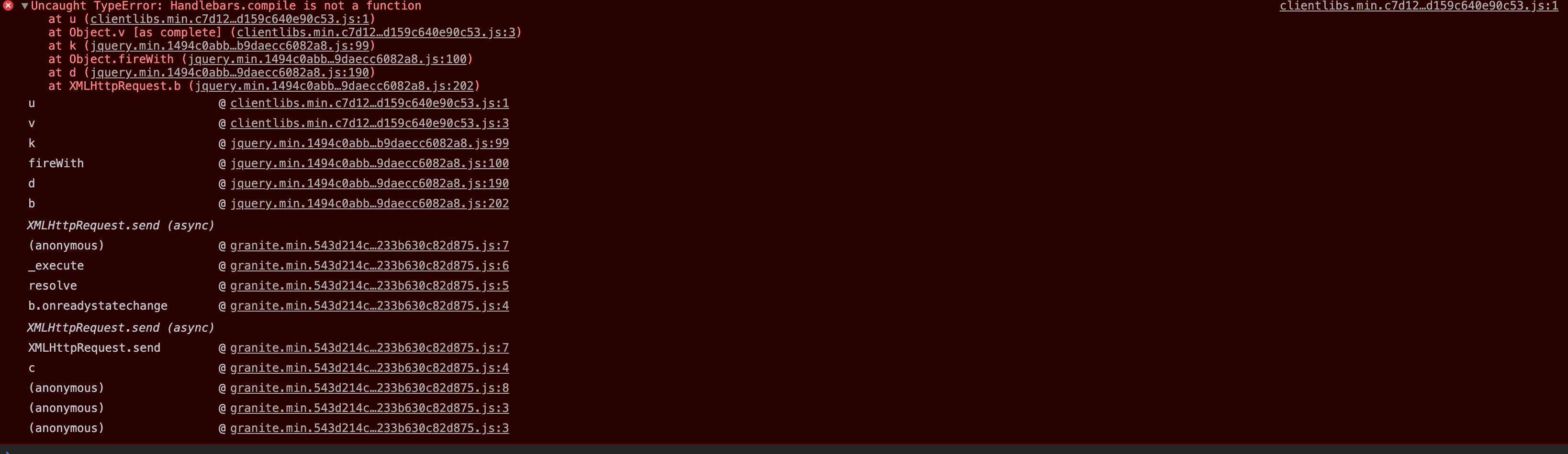 I am running into an interesting bug, I am not able to publish any content from Author > Publish on AEM 6.5.3 on only one specific environment, I am not running into this issue on any other environments. This issue is observed as a part of 6.4 to 6.5 upgrade. The replication agents etc are all configured and nothing (specific) in the logs. The only error seen is in the browser, which is "Uncaught TypeError: Handlebars.compile is not a function". I've also checked out this article which points to a similar issue, but not helpful. I don't see this error in Edit mode, I only see this error when I try to publish any content, the page is blank, I don't see the publish button on top right. My project has not overridden any OOTB features or clientLibs that uses Handlebars, so I don't understand the handlebars exception. ACS version is v4.3.4 if thats of any help.