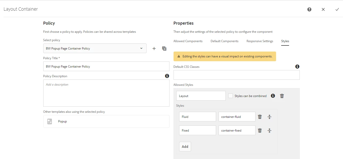 We are trying to create custom Layout Container(wcm/foundation/components/responsivegrid) component in AEM 6.4 to have fixed width and full width layouts in our project. Below are the steps i followed to create an editable template but unable to see Allowed Components even after creating a policy and configuring components.