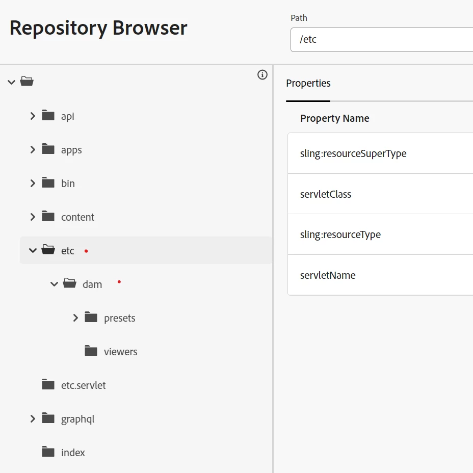 The complete folder structure under /etc does not appear in the repository browser for the preview pod. It does appear for publisher and author pods at the moment.