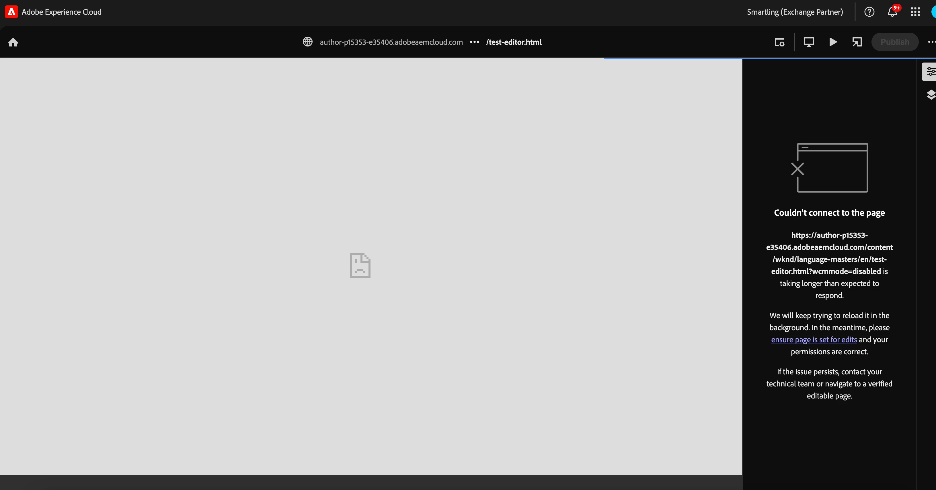 But UE doesn't recognize the page. I went here https://experience.adobe.com/#/@smartlingexchange/home opened `Experience Manager` -> `Universal Editor`, put link to the page https://author-p15353-e35406.adobeaemcloud.com/content/wknd/language-masters/en/test-editor.html?wcmmode=disabled and launched the editor. It shows `Ooops` page