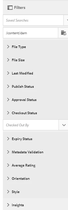 Go to "localhost:4502/assets.html/content/dam" and click on Box icon on right hand side below the header -> click on Filters