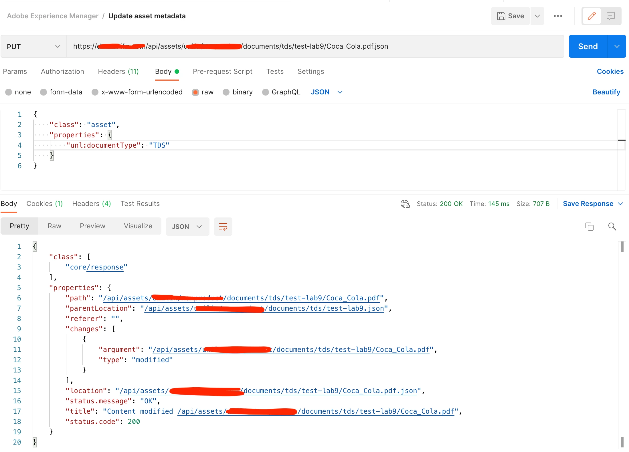 I'm communicating with Adobe Experience Manager, Version 6.5.6.0. I'm trying to update metadata of an existing asset.
