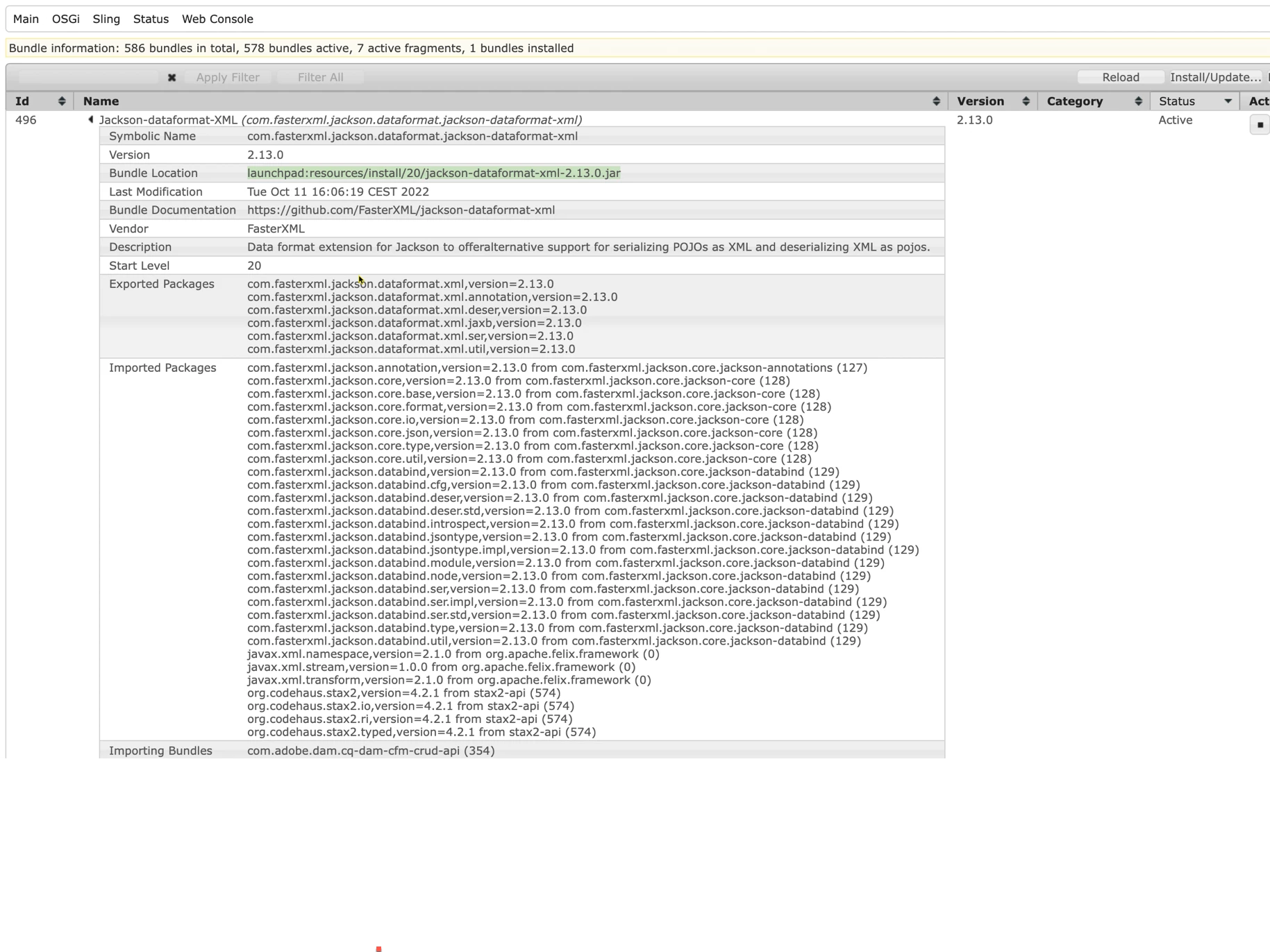 Bundle is present in platform, installed from launchpad:resources/install/20/jackson-dataformat-xml-2.13.0.jar in active state