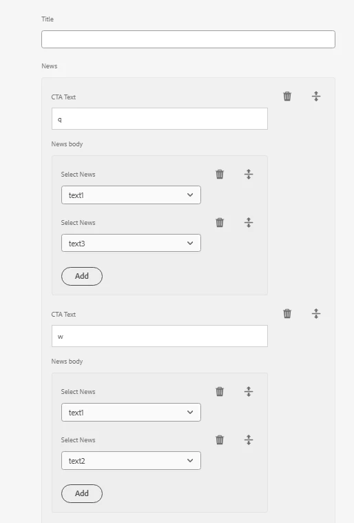 The servlet is setting the dropdown list nicely and XML is also retrieving it. While I'm adding "News body" field inside the "News", its getting the dropdown well. But while I'm adding several "Select News" items under same "CTA Text" It's not adding as expected & the UI is breaking in that particular area only. The image is added also(please click multi-field to see below). In green marked field, the "Select News" is added successfully after clicking add. But in the red marked field, "Select News" is not added although I've clicked add button, The UI is also get broken in that area.