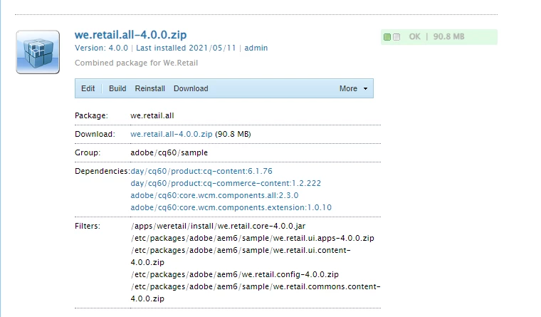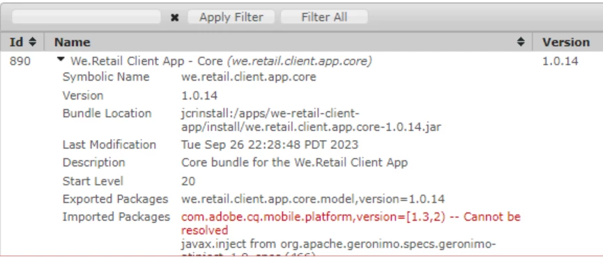 In one of our author instance, the We.Retail client APP -Core bundle is always showing as installed state with some dependency issue. We are unable to make it active.