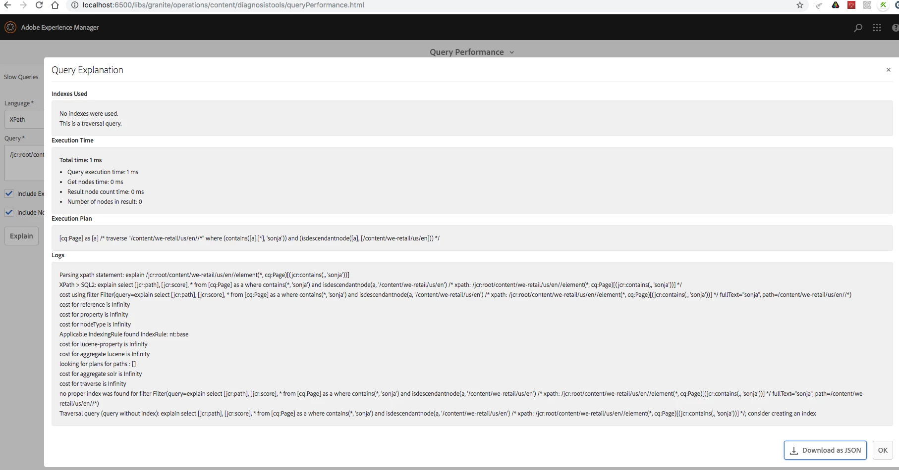 I am trying to make AEM search to search for "sonja" jacket with traversal node to see how much time it will need.