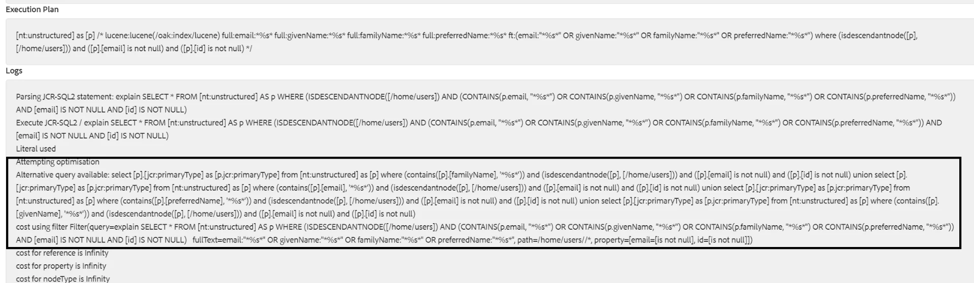 SELECT * FROM [nt:unstructured] AS p WHERE (ISDESCENDANTNODE([/home/users]) AND (CONTAINS(p.email, \"*%s*\") OR CONTAINS(p.givenName, \"*%s*\") OR CONTAINS(p.familyName, \"*%s*\") OR CONTAINS(p.preferredName, \"*%s*\")) AND [email] IS NOT NULL AND [id] IS NOT NULL)