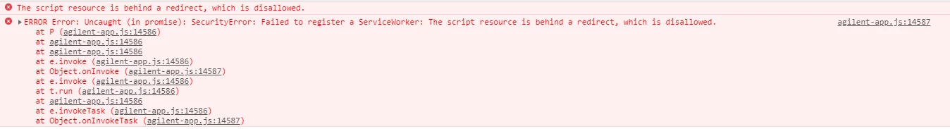 ERROR Error: Uncaught (in promise): SecurityError: Failed to register a ServiceWorker: The script resource is behind a redirect, which is disallowed.