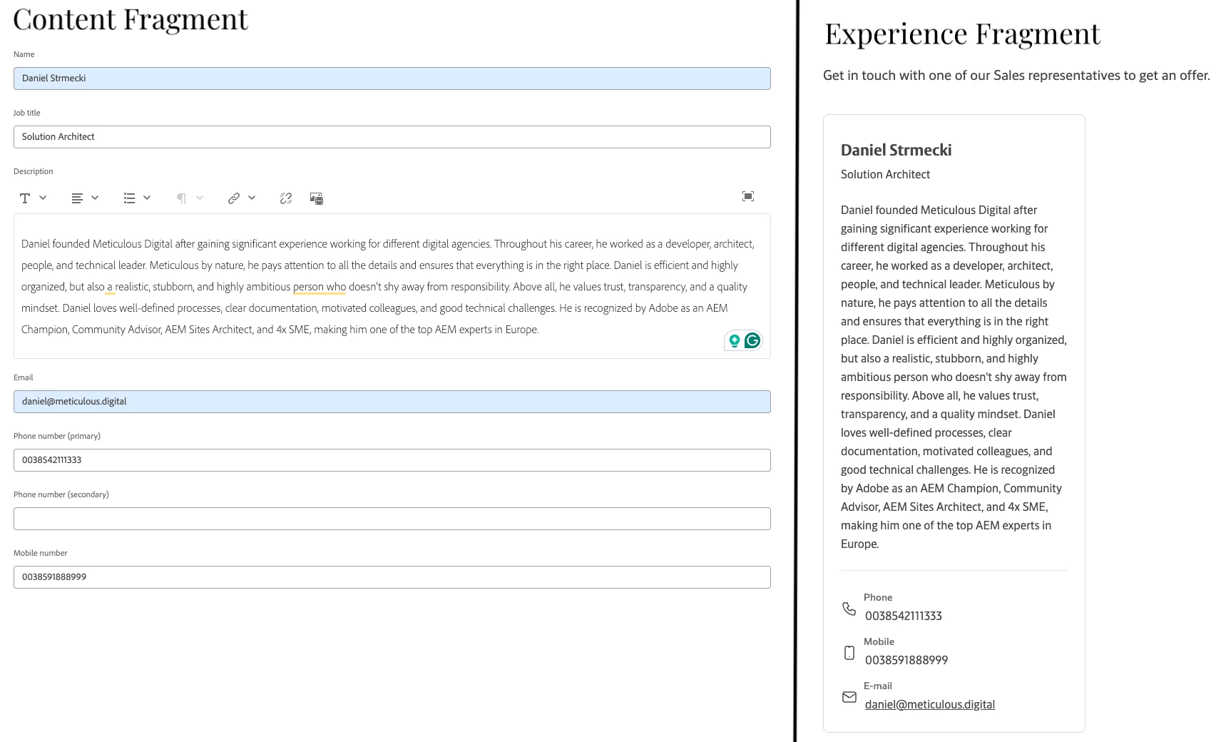 Content Fragments are best used when we need to manage structured, reusable content that isn’t tied to a specific presentation. They’re ideal for information that needs to appear consistently in multiple contexts, such as contact details, author bios, FAQs, or press releases. They’re suitable for reusable content that may need to look different across various channels.