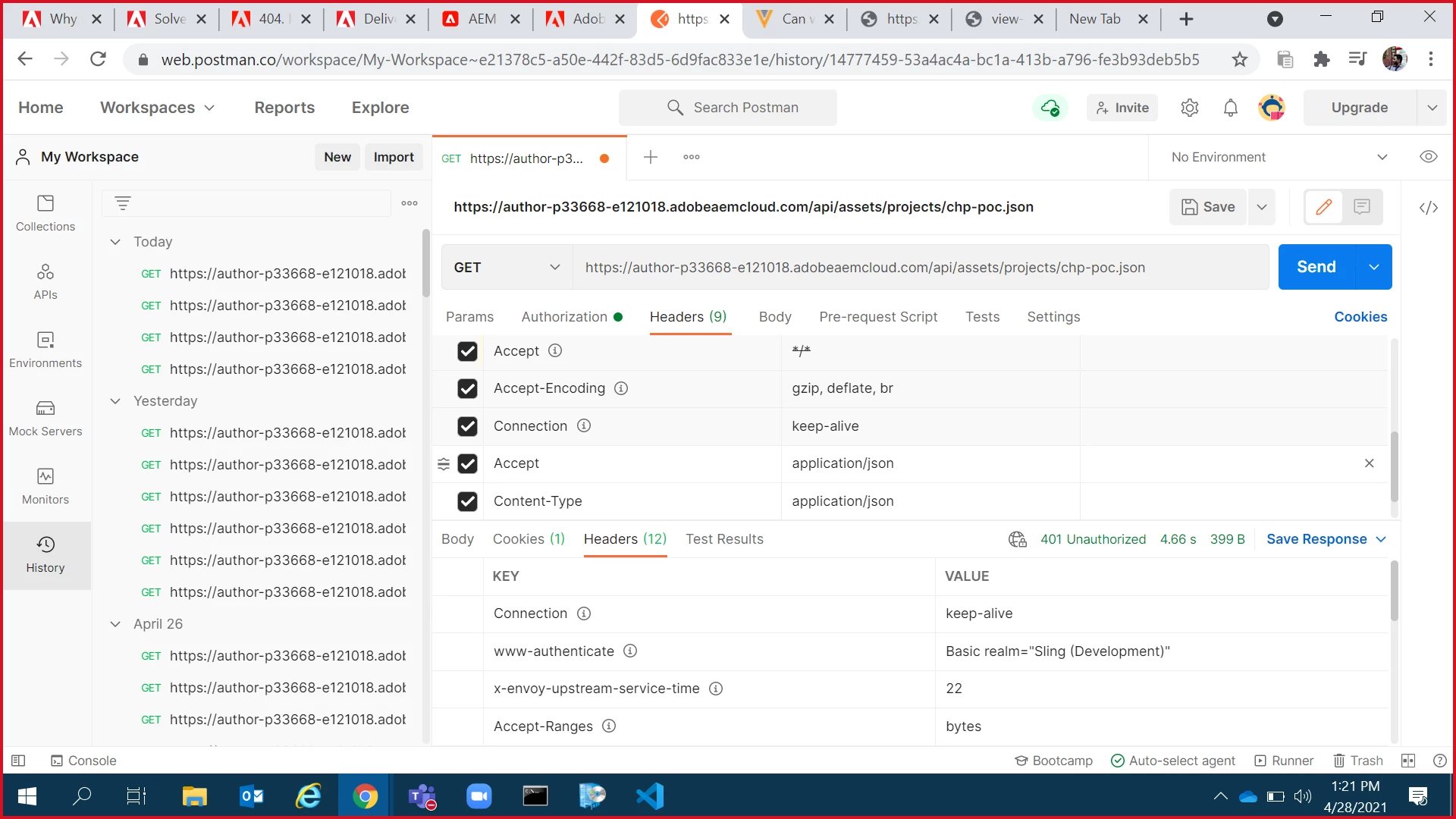 I am using a sandbox environment for aem. I want to use rest API of AEM and while using them on chrome browser I am getting a json response but while using those APIs in postman I am getting status 401 Unauthorized in response and body part of response is blank. In response headers I am getting www-authenticate header as Basic realm="Sling (Development)". I have matched username and password in authorization parameter that is correct.