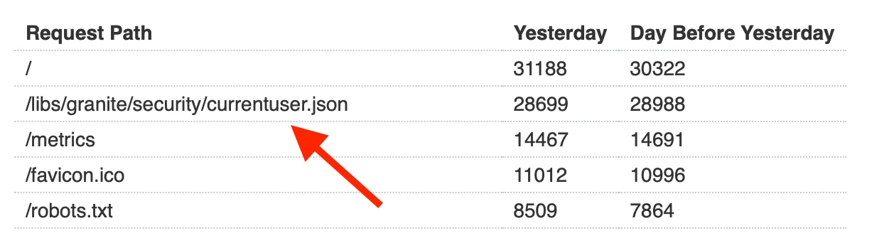 I've created a Splunk report that counts all requests to AEM Publisher with the same path. I've noticed in the report that we are getting 28k+ requests towards "/libs/granite/security/currentuser.json" daily.