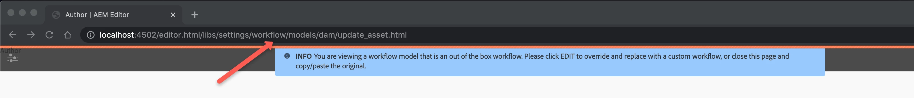 - With the Workflow Model Editor open, modify the browser's address URL, and replace the path segment /libs/settings/workflow/models with /etc/workflow/models.
