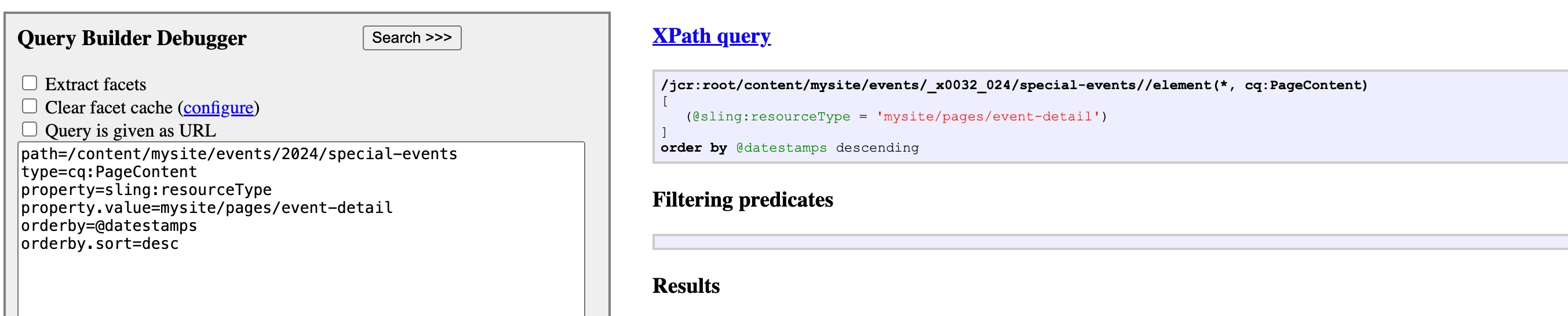 /jcr:root/content/mysite/events/2024/special-events//element(*,cq:PageContent)[@sling:resourceType='mysite/pages/event-detail' ] order by @datestamps ascending