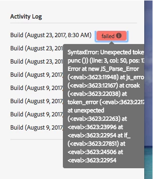 This error messaging should specify the extensions/rules/data elements that have caused the build to fail, and where possible, why in simple language. Where it's a syntax error, I'd be looking for messaging that's similar to what we currently see in the DTM code editor, as per Code Checking in Code Editor .