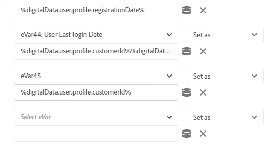 @andrey_osadchuk: Yes, I can see the list of evars. Let me explain you better. I only migrated from DTM one property and linked to this property in Adobe Launch to DEV, STAGE and PROD. My aim is to add the Customer id(crm_id) evar to DEV Report Suite and send it in the beacon, this only for DEV. What I noticed, if I enable this new evar in PROD Report Suite, I can see in the drop-dwon evar 45:Customer ID, otherwise I only can see evar45. How can I add this evar only to DEV environment for Launch and Report Suite?