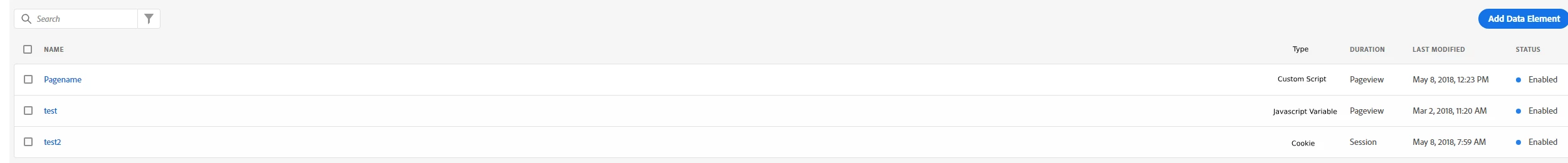 I would like to be able to see the type of the Data Element in the Data Elements List Page. An additional column could be added which shows the Data Element Type (similar as it was to DTM). For this the value from the "Data Element Type" field in the Data Element could be used.