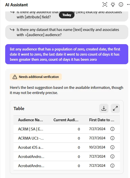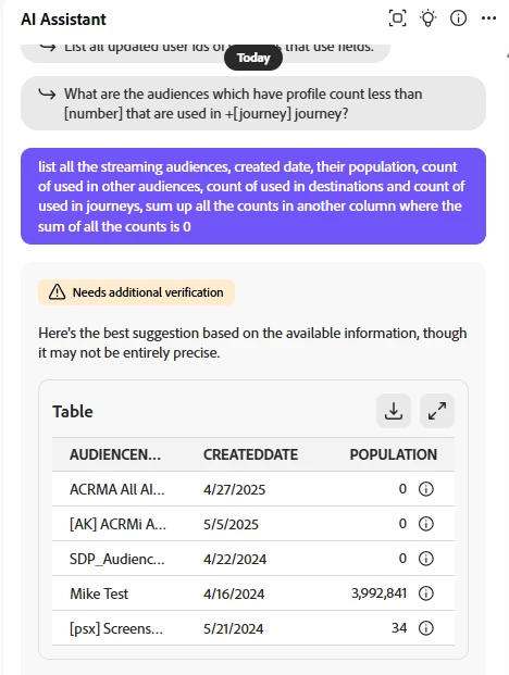 While I could scroll through the UI looking for all audiences with no profiles in it or even make some API calls, I’m now trying to use AI Assistant for everything first.