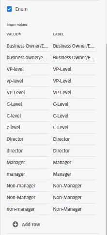 Is it possible to assign multiple enum values to one label? We have various spellings of the same value (ex. vp-level, VP-level, VP-Level) across our data but I would like to display only one version (ex. VP-Level) in the attribute drop-down list. I tried to do this by adding all the enum values and pointing duplicates to the same label but I end up with an equally long drop-down. My goal is to have a clean and condensed drop-down list without missing any contacts due to discrepancies in spelling. Is there another way to achieve this?