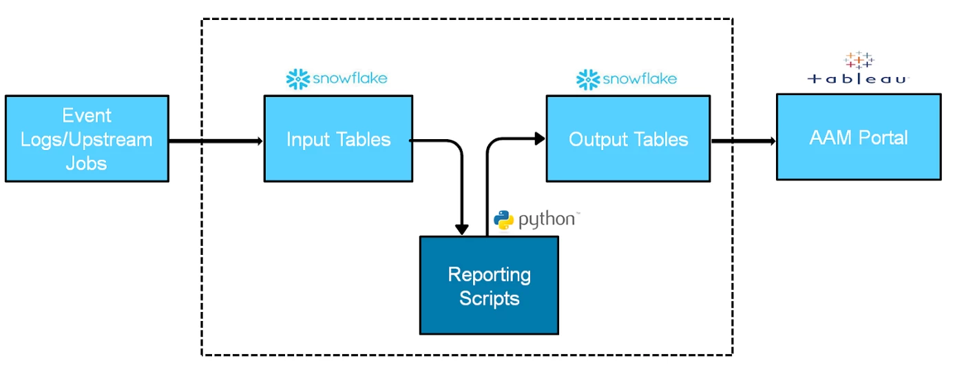 These Snowflake tables serve as input and output tables for our reporting scripts, which are basically Python scripts that apply business logic to the input table’s data in the form of SQL. The result is then returned to the output tables and rendered as reports using Tableau.