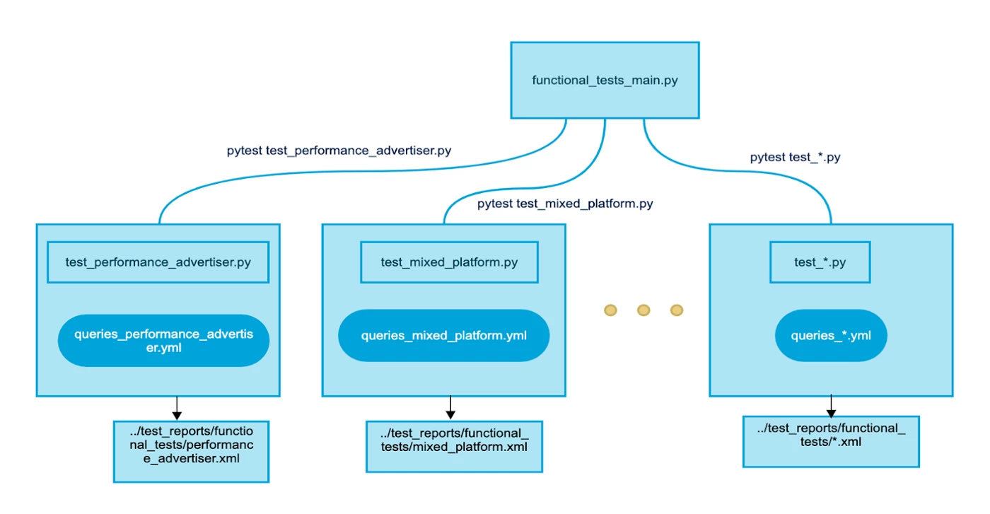 As shown in the diagram above, running a test begins with the functional test name. Then, for each test in the functional test directory, a separate sub-process is spawned with its own test file and queries YAML file for simultaneous execution and validation. Once the test has run, the output is published in an XML file.