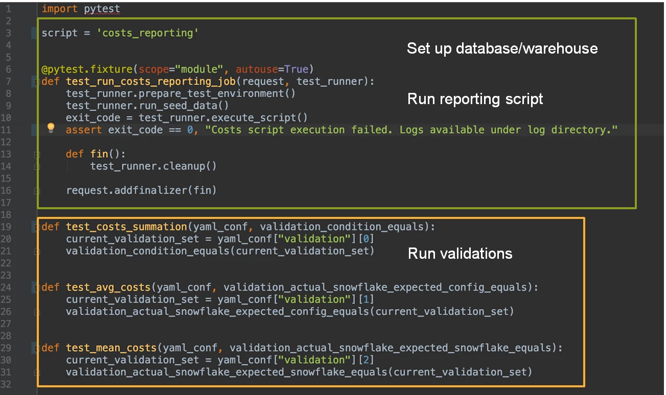 - Complex business logic in SQL: In specific applications, most of the business logic is stored in the SQL, and very little in the actual Python script. While the script can easily be assessed using a unit test framework, the business logic in the SQL requires a much more sophisticated solution.