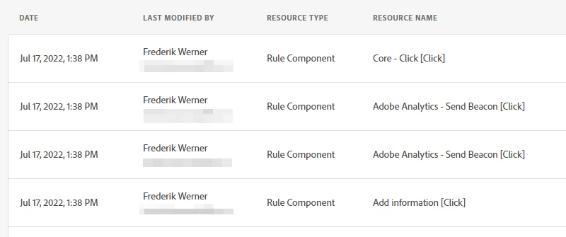 For a system like Adobe Experience Cloud Experience Platform Dynamic Data Collection Launch, by Adobe Tags, it is very important to provide a clear view on what has been changed when and by whom. This information is available already through the amazing Audit Event tab. However, it can be tricky to figure out what has changed due to the information being presented in a different place from the resource in question, like a Rule's Action. For example, looking for information about who changed a Rule's Action is difficult, because the displayed information would only work if every Action has a unique name: