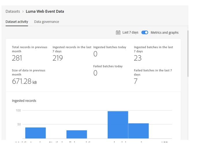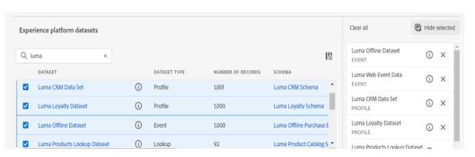 Website data: If adobe analytics is implemented already, you can use Adobe analytics source connector to ingest data into AEP datasets through batch ingestion. If you are using AEP WEB SDK, you can send data to the AEP Edge network directly. As you can see in the below screenshot, ‘Luma Web Event Data’ is the dataset that I have created to collect the website event data using Adobe Analytics source connector.
