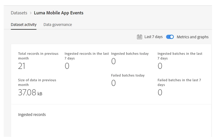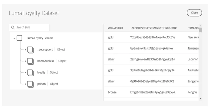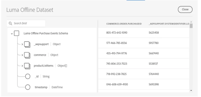 Mobile App data: Similarly, all the mobile app event-level data can be sent to AEP using either the Adobe analytics source connector or through the edge network. Below is the snippet of the dataset, which collects all the Luma mobile app data using the Adobe Analytics source connector.