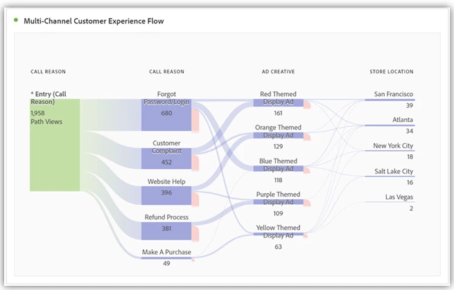 · Visualize cross-channel journeys: You can visualize any brand touchpoint in the exact order it occurs. For example, study the journey of customers who called a call center, saw a display ad, and then visited the physical store.